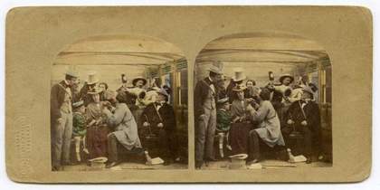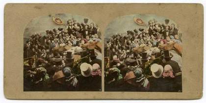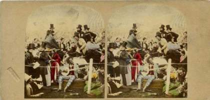Stereography had the potential to take the viewer inside the crowd’s jostling and excitement. ‘The elbow of a figure stands forth so as to make us almost uncomfortable’, as Holmes observed. To this end, the London photographer Alfred Silvester (1831–1886) published two series based on the Epsom Races, National Sports, The Race-course [N00615] (fig.7) of which there are several variations echoing the different scenes within Frith’s painting, and The Road, the Rail, the Turf, the Settling Day (1859) a series of five. They were the portrait shape required by the stereoscope rather than panoramas like Frith’s painting, but Silvester squeezed in dozens of people. The Turf (fig.10) contained an astonishing 60 gesticulating figures in front of a painted backdrop of more distant crowds. Carriage wheels and cylindrical top hats occupy the foregrounds to enhance the three-dimensional effect.