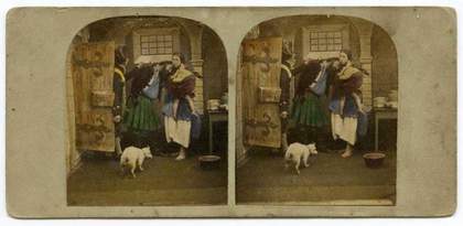 Gaudin’s stereograph was not a copy of Millais’s composition; it was a response to it. His image combined a backdrop painted in the conventional way behind the figures with real furniture and a door jutting out in front. Such round and rectangular geometric objects became common in stereographs because they created clear three-dimensional shapes. Like Millais, Gaudin used real models. They express the sternness, despair and stoicism of the gaoler, soldier and wife. The child’s bare legs and feet and head dropping on the mother’s shoulder indicate that s/he is sleeping, innocent of the tense exchange. The dog is probably an example of taxidermy as a real one is unlikely to have stayed still while the photograph, which would have been exposed over several seconds, was taken. Since they were taken and developed, the pictures have been hand-coloured.