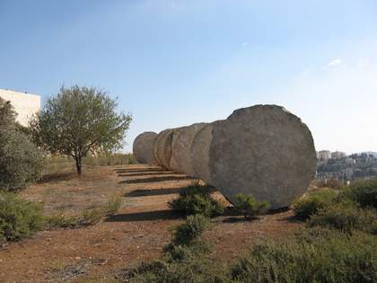 Creates Negev at the Billy Rose Sculpture Garden, Jerusalem. Abakanowicz is impressed by the local limestone filled with fossils. Stonemasons carve seven ten-ton wheels that sit along a precipice. Negev is a response to the barren desert, the silence of its rocks, and the prehistoric shores of the Mediterranean. At the same time, its round forms resemble wheels or millstones.
