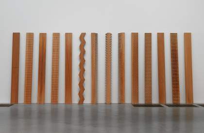 Susumu Koshimizu is a Japanese artist known for making sculptures that expose the surface quality of different materials. He is considered a key member of the Mono Ha movement ('School of Things'), which reacted against the embrace of technology and visual trickery in mid-1960s Japanese art. The Mono Ha artists sought to understand ‘the world as it is’ by exploring the essential properties of materials, often combining organic and industrial objects and processes. In From Surface to Surface originally made in 1971 and remade in 1986, Koshimizu investigates the substance of wood by sawing planks into different shapes, exposing their surface qualities through different kinds of repetitive cuts.