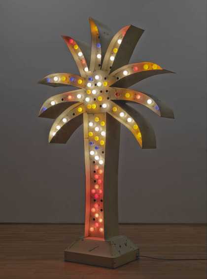 Palm Sign is a large painted metal sculpture of a palm tree, illuminated with coloured light bulbs. It has the run-down look of a decaying beach sign in a tired holiday resort.