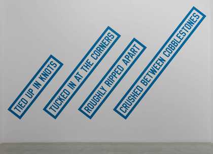 Fiona Banner’s ‘wordscapes’, are large text works that recount the plots of feature films and other events. Break Point 1998 is a large painting comprising sixty-six rows of red text written horizontally on a white background, which collectively describe a car chase from the film Point Break (dir. Kathryn Bigelow, 1991). Banner explores the limits of verbal communication in her work: rather than watching an exciting fast-paced action scene viewers have to read the narrative in a deliberate and painstaking manner. As Banner commented: ‘when it’s translated into words … [the scene] becomes this kind of shaggy-dog story … the opposite of keen imperative momentum’.