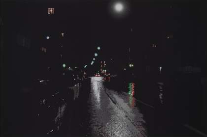 An urban street at night is also the subject of Julian Opie's Rain Footsteps Siren 2000. The street could be anywhere and somehow feels familiar. To create this striking image Opie scanned a photograph of a street at night onto a computer and altered it digitally, emptying the image of detail by blocking in areas of flat colour. The result is a generalised or universal image of an urban scene at night.