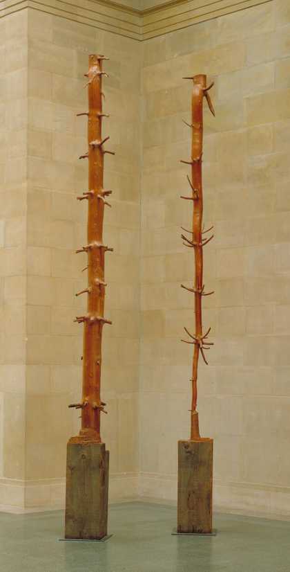 The organic curves of Richard Deacon's sculpture suggest various things. The title is taken from the Biblical phrase 'He that hath ears to hear let him hear' and relates to Deacon's interest in the way eyes, ears and mouths channel our perceptions of the world. But the shape of the sculpture also resembles forms found in nature, echoing the shape of a hilly landscape as well as the shapes of clumps of trees and tree roots. The sculpture is made from wood and the oozing resin and rings in the wood are reminders that this material was itself once alive, and part of nature.