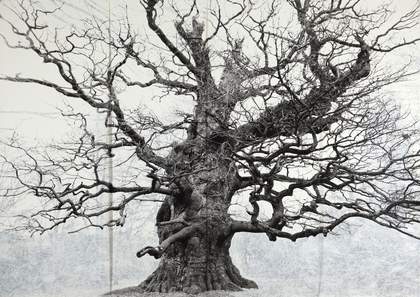 This is one of a series of ancient trees that artist Tacita Dean chose to photograph. It is one of the largest and oldest complete oak trees in England. Dean photographed the tree in high resolution and the photograph was printed and presented on a large scale, giving us the opportunity to examine its features in detail. She also painted out the landscape surrounding the tree with white paint, which makes us concentrate on its details without the distraction of the background. We look closely at the texture of its bark, the gnarled knuckles of its roots, the way its branches spread and feel that we 'get to know' the tree – in the way that we gaze at portraits of people to work out what they might be like. So this is a kind of tree portrait.