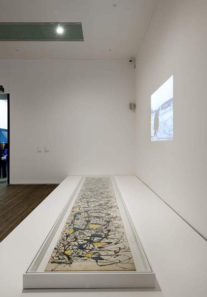 Installation view of Jackson Pollock’s Summertime: Number 9A with footage of Hans Namuth’s film playing above in A Bigger Splash 2012