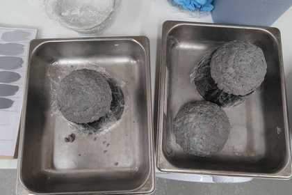 Grey acrylic emulsion paint was applied to hemispheres covered in papier mâché, created using bowls as moulds