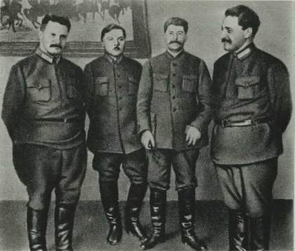 Left to right: Mikhail Lashevich (suicide 1927); Mikhail Frunze (died 1925); Nikitich Smirnov (shot 1936); Alexei Rykov (shot 1938); Kliment Viroshilov (died 1969); Stalin; Nikolai Skyrpnik (suicide 1933); Andrei Bubnov (died in Gulag 1940); Sergo Ordzhonikidze (suicide 1937); Josef Unschlicht (shot 1938).