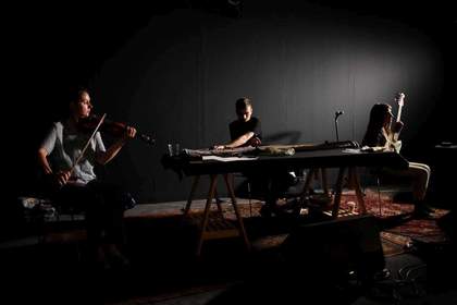The new generation of performers rehearsing Tony Conrad’s Ten Years Alive on the Infinite Plain for the LightNight performance at Tate Liverpool, 2019, with documentary filming being carried out by Will Wilkinson. Performers from left to right: violinist Catherine Landen, long string drone player George Maund and bass guitar player Emily Lansley