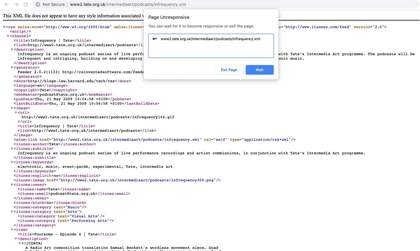 The page for the Infrequency Podcasts series from 2008, http://www2.tate.org.uk/intermediaart/podcasts/infrequency.xml, accessed 1 August 2019. The page has lost all design and formatting information, making it almost impossible to navigate.