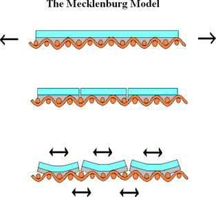 The diagram illustrates how all paintings on stretched canvas deteriorate, first through embrittlement and cracking, then through long term relaxation under tension. Much of the tension is carried in the paint and ground, not in the canvas, but where the paint cracks, all the tension is taken by the canvas. Re-alignment of forces causes the islands of paint to cup and separate from the canvas