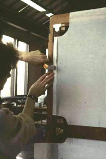 There are limits to the dimensions of individual panels but they can be joined indefinitely to make larger panels. Very large panels are heavy and difficult to lift unless handles are built in. A panel cannot be keyed out, but I think this is a fairly minor limitation, since it is possible to stretch a canvas adequately without keying out. If the canvas has not been stretched enough it should be re-stretched. It can then be left alone. In future if there is relaxation of the canvas it can also be re-stretched but the relaxation will be kept to a minimum by the original low tension and the absence of repeated keying out. However, a panel does alter the appearance of the canvas painting from the reverse and changes its character fundamentally.