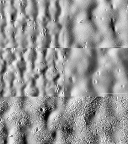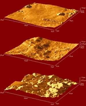 Atomic Force Microscopy is an imaging technique used to extract visual, physical, thermal and electrostatic information from samples down to a possible resolution of nanometers. There are many different operating modes and resolutions that will be explored during the course of the research however, to date; AFM has been assessed for its ability to image the surface of acrylic paint films. Fig.8 shows AFM images of three pieces of Grumbacher titanium white free film. The uppermost sample is the control, the sample in the centre has been immersed in distilled water for a period of two hours, with a period of two hours drying in ambient conditions, and the lower sample has been immersed in acetone. The images confirm that AFM can successfully image the physical changes caused by these treatments and that the acetone immersion displays a considerably greater swelling and disruptive effect than water.