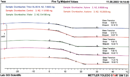 Differential scanning calorimetry (DSC): At GCI, the method was based on ASTM E 1356,9 using a Mettler Toledo DSC822e instrument, operated with Stare software. Analysis was carried out under a nitrogen atmosphere with temperature range of -60°C to 100°C at a rate of 10°C/min. Three layers of paint were used and samples weighed prior to testing. At X-aT, the analysis was carried out on a Mettler 821e instrument, under a nitrogen atmosphere with a temperature range from -70 to 120°C at a rate of 10°C/minute. Two layers of paint were used and samples weighed prior to testing.