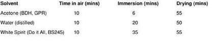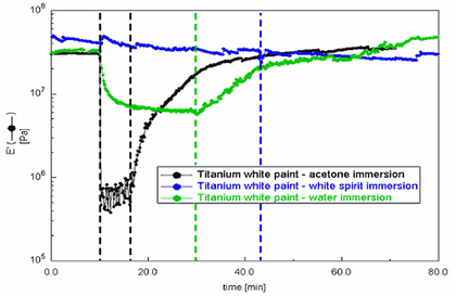 DMA modulus data can also be acquired whilst the sample is fully immersed in a liquid. This provides information on the relative stiffness of the paints during immersion and the relative amount of creep each sample undergoes when subjected to a constant load. To assess this, free films of Grumbacher titanium white were immersed for varying periods in water, acetone and white spirits, and the storage modulus data collected over a period covering pre-immersion, immersion and post- immersion, as described in tab.5.