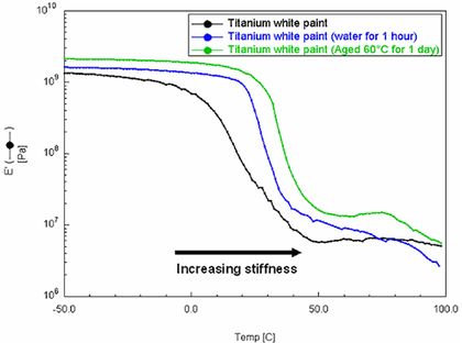 Overlayed DMA modulus curves of Grumbacher titanium white paint after immersion in water for 1 hour and thermal ageing for 24 hours at 60°C