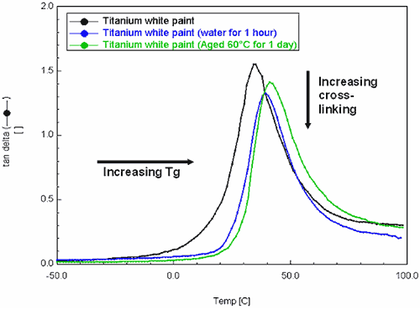 Tan Delta also provides information on the cross-linking or polymer chain density of a paint film, providing another indicator of relative stiffness. The decreased apex heights of the immersed and aged samples indicate that the material may have cross-linked to a greater extent than the control, and/or that material has been extracted from the bulk film.