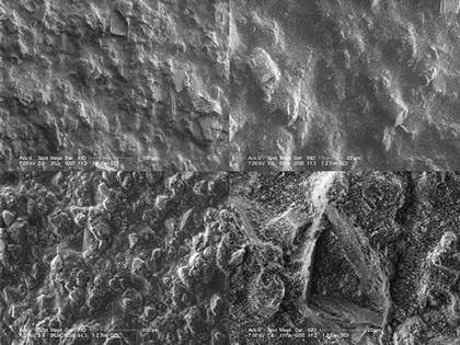 Environmental scanning electron microscopy (ESEM): Images were captured at 200x magnification with a Philips-FEI XL30 ESEM-FEG and adjusted using Photoshop 7.0. The accelerating voltage was set between 7 and 10 kV, the vacuum from 1 to 1.2 Torr, at a working distance of between 9.6 and 10.5mm.