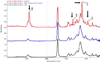 Fourier transform infrared spectroscopy – attenuated total reflectance (FTIR-ATR): ATR spectra were obtained (200 scans at 4cm-1 resolution) on a Nic-Plan FTIR microscope (Nicolet) using a Spectra-Tech ATR objective with zinc selenide crystal. System was purged with dry air and data was processed with Omnic 4.1 software (Nicolet).