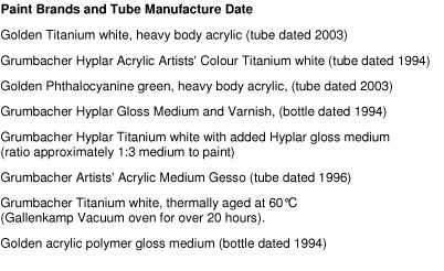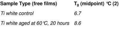 In order to asses the effect of ageing on physical properties, two samples of the same Grumbacher titanium white paint film were analysed, including one that had been thermally aged for twenty hours at 60°C. The results (tab.4) show an upward shift in Tg for the thermally aged sample, confirming observations of increased film stiffness with age. However, as this paint may not have been fully cured, the shift may have also resulted from the further drying of the paint.