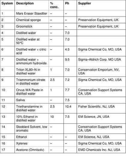 A total of eighteen systems were selected (tab.2), aimed at representing most classes of the more commonly used cleaning systems that were mentioned in literature reviews and/or consultation with conservators of modern art. These include three dry cleaning methods, ten aqueous and four organic solvents. The organic solvents were included because they have occasionally been employed for overpaint/vandalism removal, and white spirits, or benzine, is being used more frequently by conservators concerned about the use of water on acrylic emulsion paintings.