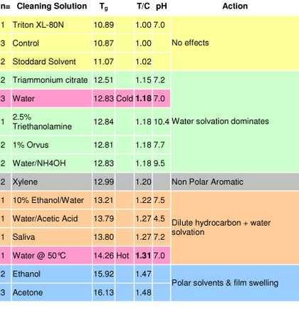 The results (tab.3) confirm that a slight increase in Tg (equivalent to an increase in stiffness) was detectable after immersion in all cases except the Stoddard’s solvent and aqueous Triton XL-80N solution, both of which had little effect. The more polar organic solvents (ethanol and acetone) caused the largest increase in Tg, indicating that polarity may contribute to the extraction of plasticizing species within the paint film. The relevance of this upward shift in Tg on the long-term physical properties of the paint film is not yet clear, and will be the subject of further research.