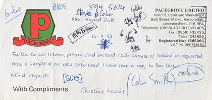 A compliment slip sent to Hamad Butt from Pacegrove Limited regarding the delivery of a sample of iodine, from Hamad Butt’s archive at Tate