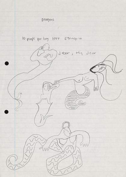 A sheet of paper from Hamad Butt’s archive at Tate, featuring sketches of merpeople and notes reading: ‘Dragons / 10 people per day HIV+ Ethiopia / Jeer, My dear’