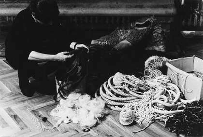 Artists working in Poland at the time were granted recognition and economic support in the form of stipends, awards and studios through the Artists’ Union. These monumental forms were made in one of those state-sponsored studios, where Abakanowicz lived and worked between 1965 and 1989. She described her first flat in a letter to art historian Michael Brenson from 1994: ‘I have spent most of my existence on the 10th floor of an apartment building together with my husband, in a tiny studio flat as the surface was limited to 9m2 per person ... We all lived in the same way amongst our neighbours – workers, writers, taxi drivers, musicians, doctors, all squashed in tiny cells.’ Creating works that she was able to fold and store was an ingenious way of not compromising her vision while working in limited space.