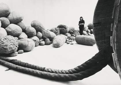 Magdalena Abakanowicz with Embryology 1978–81 and Wheel and Rope 1973 in the Polish Pavilion at the Venice Biennale, 1980