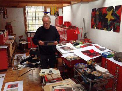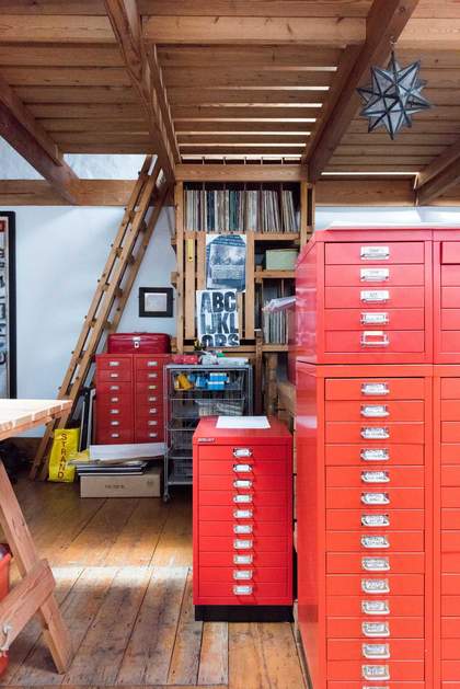 The attic studio. Red cabinets which stored King's photography and archive materials (centre) and painting by King (far right)