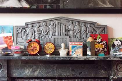 Mantlepiece in ground floor study. Photograph of David King (far left), his book Red Star Over Russia and an image of a panda, his favourite animal (far right)