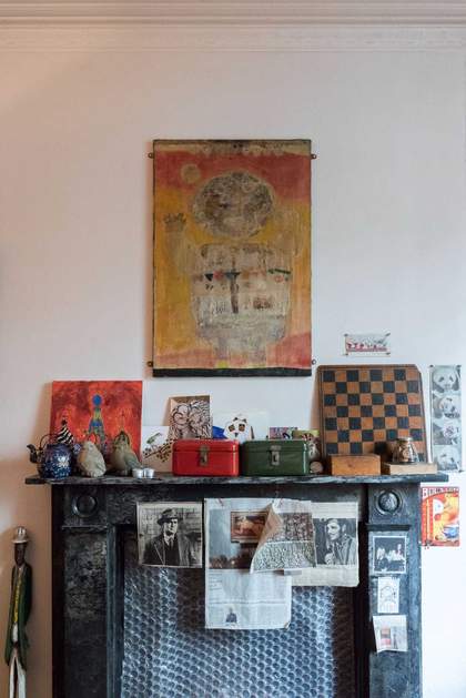 Front room. Toy panda (far left), two paintings by Judy Groves (centre) and a portrait of King's partner, Valerie Wade, aged 11 (far right)